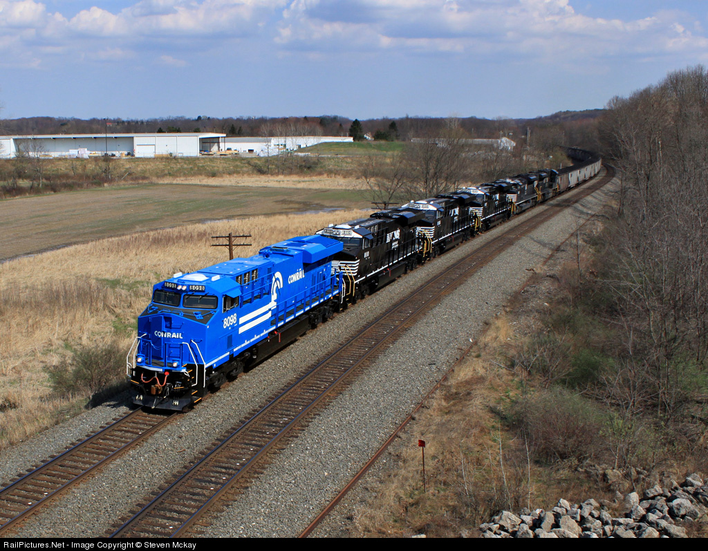 NS 8098 makes it's first revenue run since being built in Erie. Here the 578 with 3 brand new Gevos and 2 ratty SD70ace's trailing behind the beautiful Heritage unit lean into the S-Curve just east of the PA/OH state line.