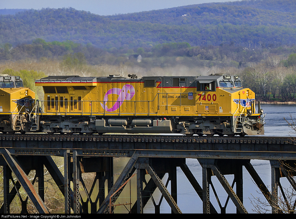 | UP Pink Ribbon Locomotive 7400 leads the hot intermodal NS 203 across the Potomac River from Maryland into WV. This locomotive was created as a tribute to the company's support of Susan G. Komen for the CureĀ® Union to raise awareness of the many lives affected by breast cancer. |