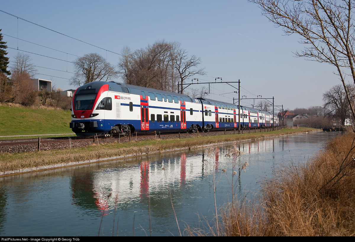 Doubledeck commuter trainset RABe 511 010 from Stadler Rail for the SBB on a test run from Chur to Oberwinterthur along the fabric canal in Bürglen.