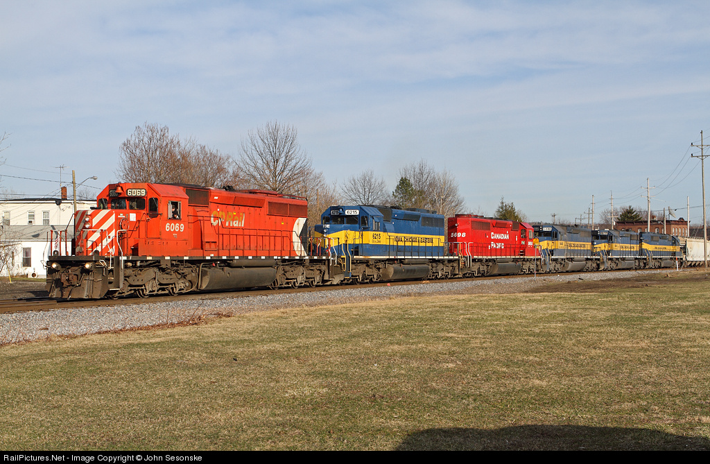 SIX SD40-2's are on the NB 450 on St. Patricks Day 2012. In addition to the normal power which includes ICE 6215 and CP 5698, ICE 6448, ICE 6414, ICE 6403 are on their way back to CP from CSX. After delivering 2 ethanol trains to CSX Selkirk the 3 ICE units plus a 4th left at Kenwood were returned by CSX on a light engine move into Kenwood.