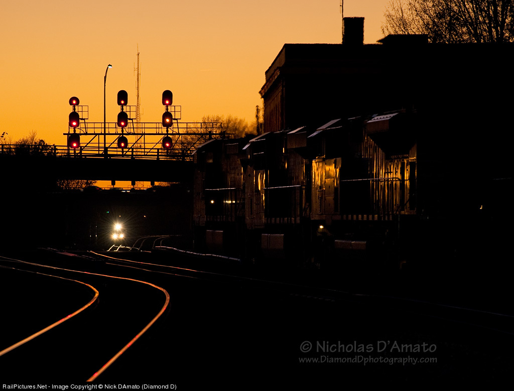 | A trio of NS units has dropped their train in the yard at Greensboro then retreated to Elm St. Here they catch the golden light of sunset while waiting for a local as it slowly heads toward the CF Line. After the local clears, they'll proceed around the wye and couple up to the rear of their train then head east toward Lee Creek, NC. This move is necessary as their is no South to East connection here between the Southern main and the H-line. |
