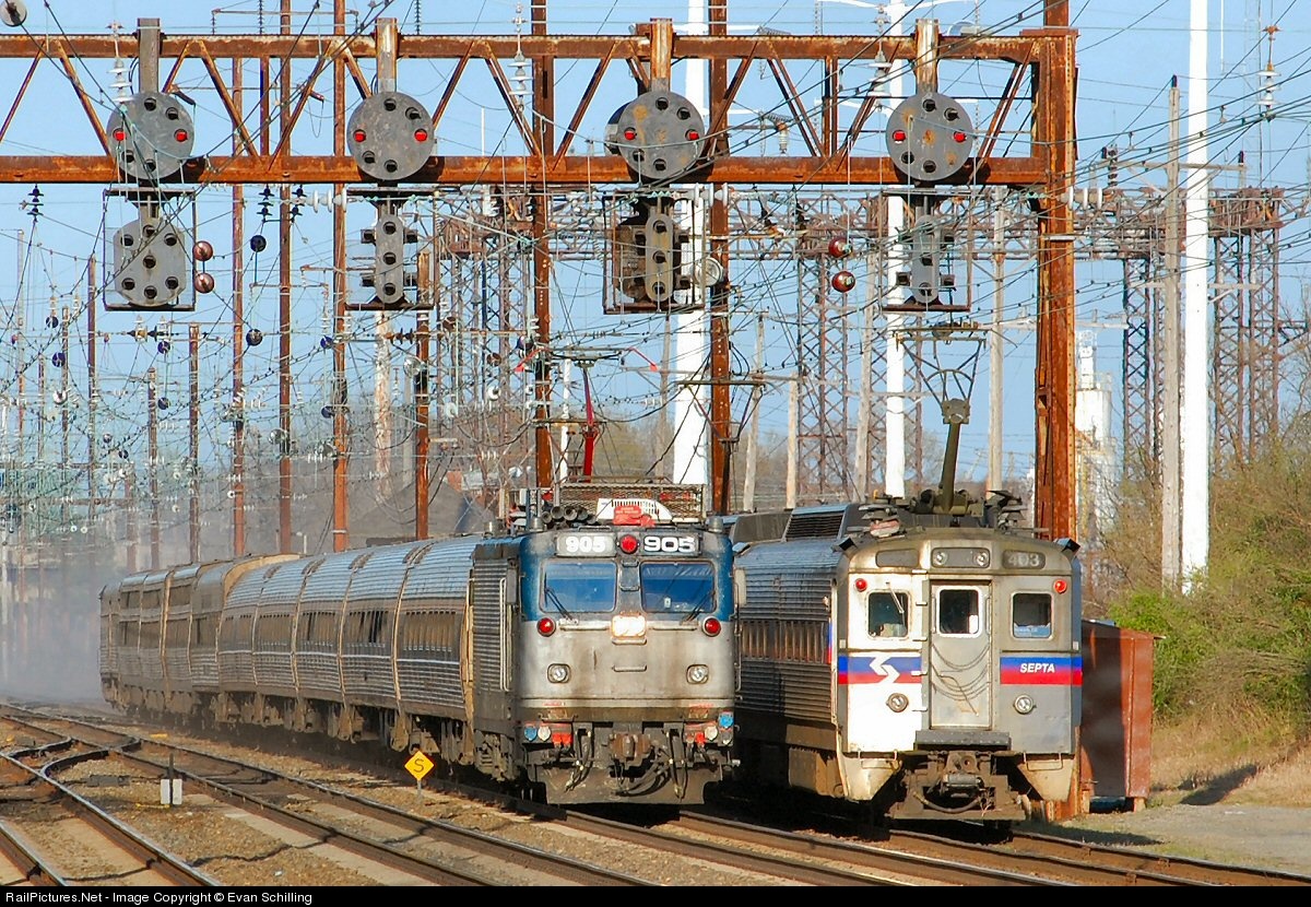 | Amtrak 905 passes the local Septa train heading South toward Maryland. The Septa train will head back North. Shortly afterward NS 904 will head onto the NEC to get into the NS yard for a recrew. |