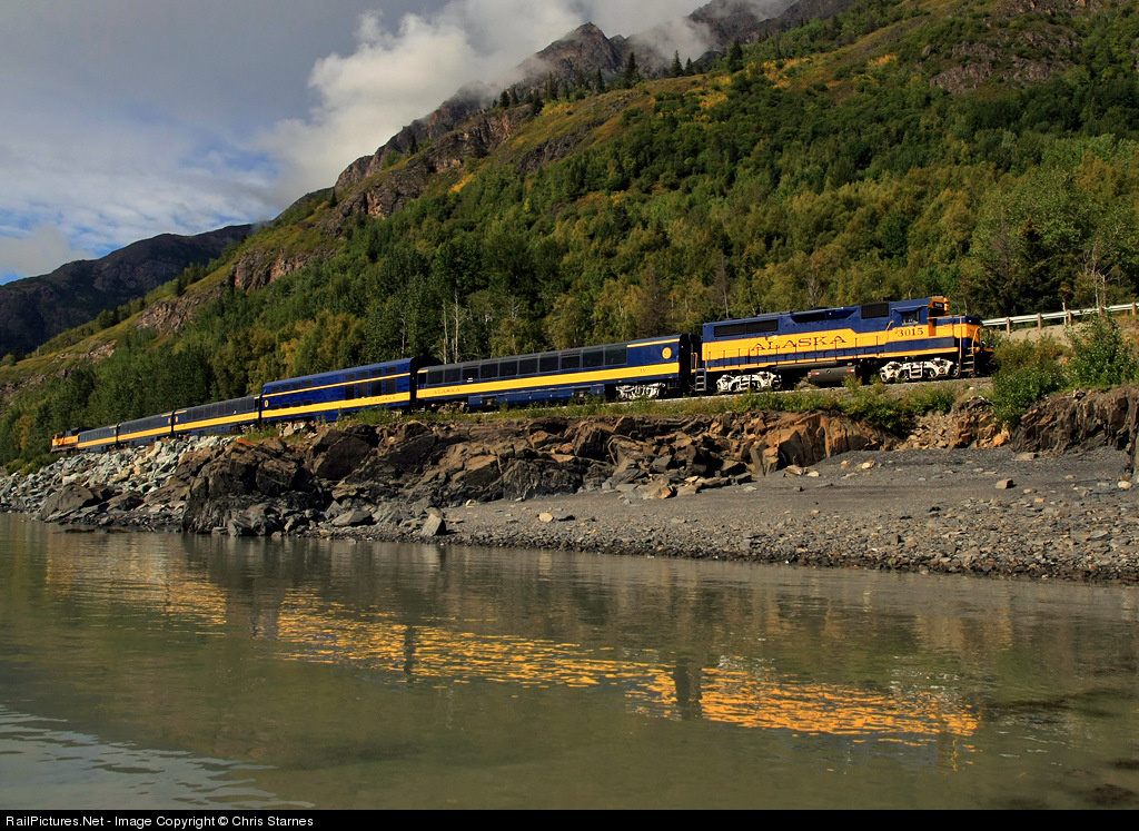 A Seward-bound passenger train skirts the Turnagain Arm south of Anchorage on a picture perfect summer afternoon in Alaska. Forty eight years ago today on March 27, 1964, the Good Friday Earthquake occurred between Anchorage and Valdez, Alaska with a magnitude of 9.2 making it the second strongest earthquake of recorded history. Some of the major impacts are still visible near Girdwood, AK today and portions of the Seward Highway seen in the background here (which parallels much of the Alaska Railroad to Seward) sank as much as 8 feet and had to be reconstructed to be higher than the new high tide mark.