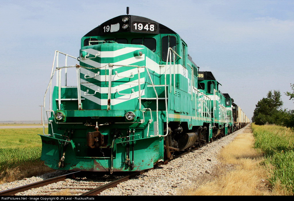 A train with wheat from Watonga is preparing to go on duty with a former Northern Pacific GP7 leading a GP7u, CF7 and a GP10 that still wears McCoy Elkhorn Coal Corporation paint.