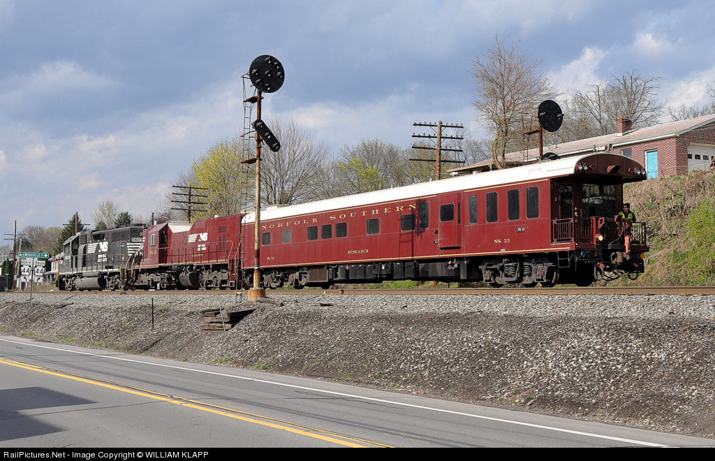 Backing up thru CP Wat. signals checking the track with NS 34 Research car , and NS 33 Research car. in late afternoon