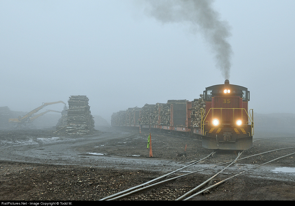 | Working in a fog. Under the cover of a thick fog the dayshift crew of the Cloquet Terminal Railroad, aboard the ex-D&NE #35 SW1000 built in 1967, goes about moving log loads closer to the plant where they will be shredded while a few material handlers continue moving their piles of logs closer to the tracks for eventual loading and processing. |