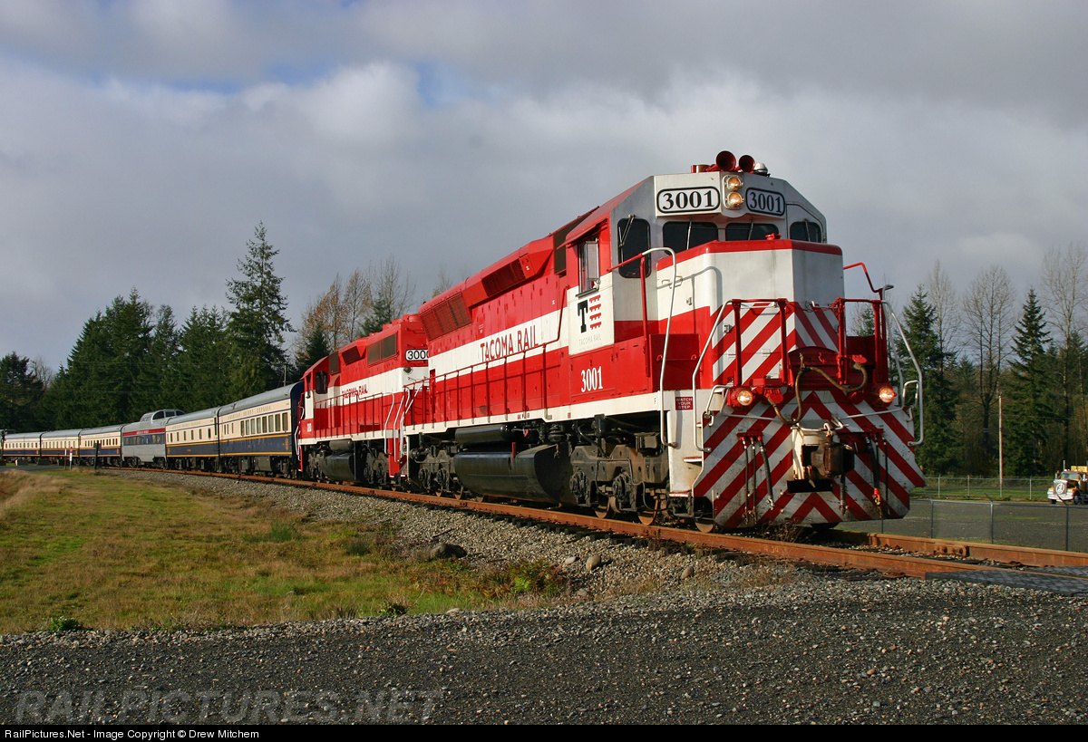 Both of Tacoma Rail's SD40-2's lead the American Orient Express on a trip back to its Home Shop at Western Junction, seen here taking the curve here at Maytown,WA 11/8/04. The train had followed I-5 all the way from Chehalis,WA to this point, and now will head east towards Western Junction, passing underneath I-5 behind the photographer.