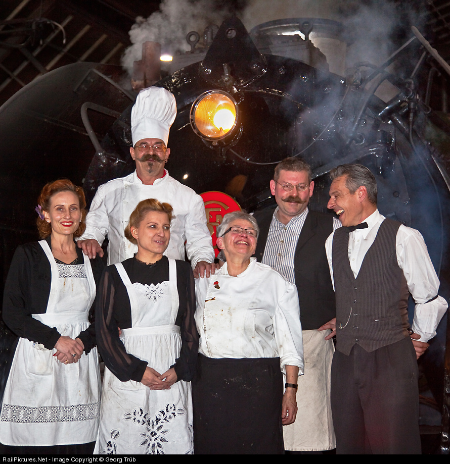 | The staff of the dining car CIWL 2749 posing on the buffer beam of the 141 R 1244, after a journey of 340 kilometers, at the buffer stop in Zurich main station. A beautiful steam train ride with excellent food and friendly service in the dining car in matching clothes. |