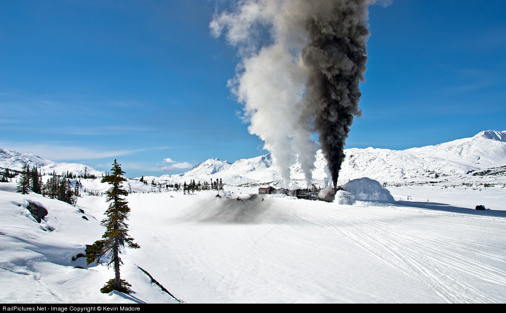 A carbon footprint stands out on an otherwise pristine landscape as the White Pass Rotary Fleet cruises through 3 ft deep snow toward Fraser, British Columbia, just a couple of miles ahead. The train is running along the shore of one of the many small ponds and lakes that line the tracks from White Pass to Fraser. Note the stark difference between the inky plume from the rotary and the white, steamy plumes from the two pusher engines. That's due to the fact that the rotary engine is working quite hard to ingest and propel the heavy snowpack. In contrast, the two steam engines are pretty much loafing, chugging along at a couple of miles per hour. The carbon footprint I spoke of is not just towering in the air either. Take a look at the dark smudge on the snow surface just to the left of the train as you view it. That's not "bad color" in my photo. It's little droplets of unburned bunker oil falling out of the rotary plume. As my fellow photographers and I discovered early on, you don't want to be standing downwind of that rotary plume. It only took an hour or two for all of us to look just like that patch of snow. We all wore it like a badge of honor for the rest of the day. Someplace, I have a photo of myself looking like I've been working in the pit at Jiffylube. I should probably make that my profile photo!