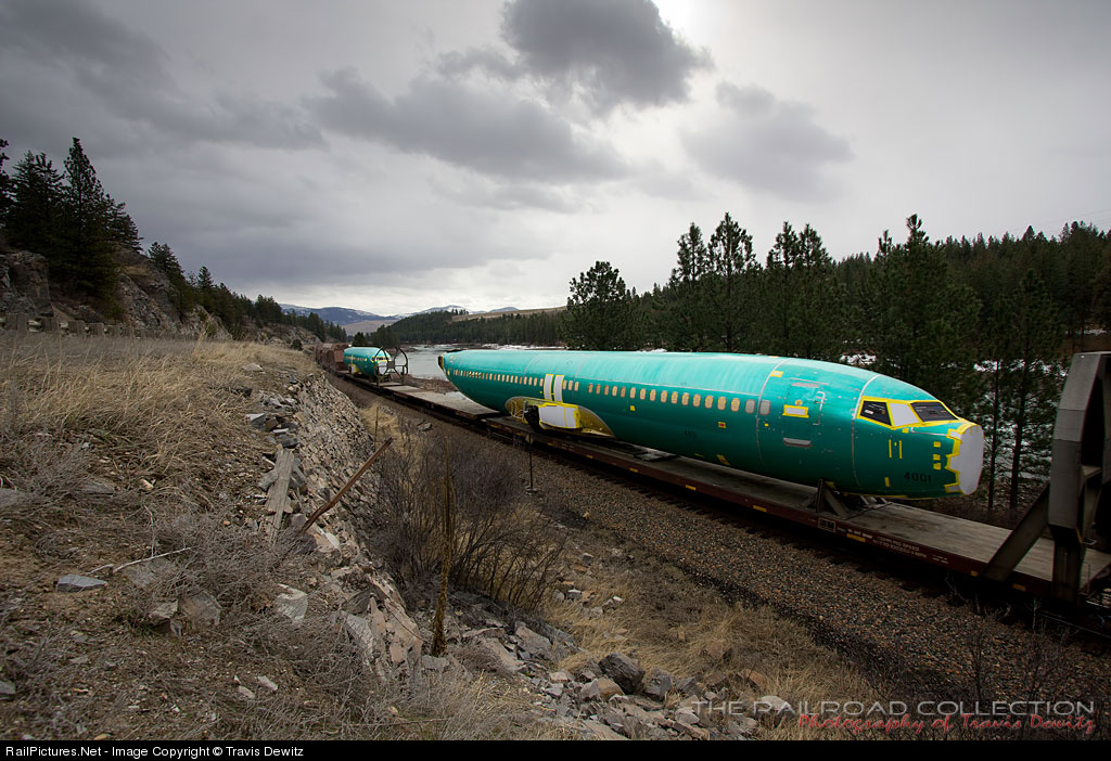| Westbound Boeing plane bodies on a BNSF trackage right train over Montana Rail Link in ironocally, Plains, Montana. |