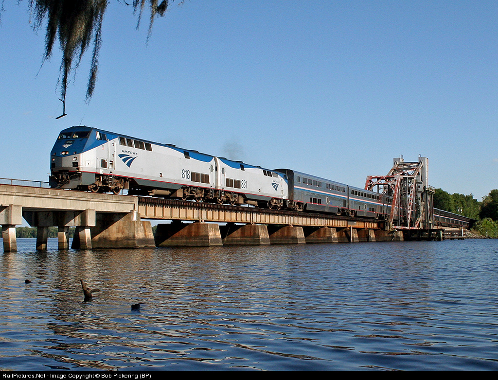 A kayak paddle of one hour brings the first views of Buffalo Bluff bridge to Railpictures.net. Here we catch Auto train rumbling across the bridge, one of 4 trains seen in about 2 hours here.