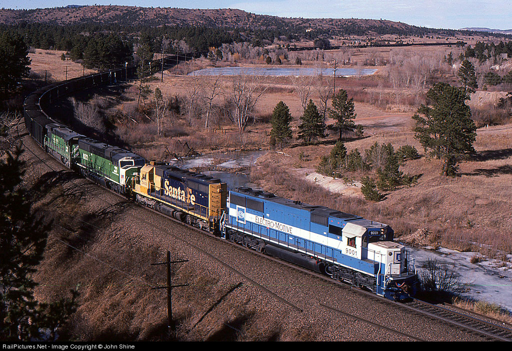 A Southbound coal load headed to Amarillo has just went over the South switch at Academy siding on Colorado's Joint line. This typical 90's lash-up includes Oakway SD60 9001, Santa Fe SD40 5013, BN SD60M 9272 and C30-7 5583