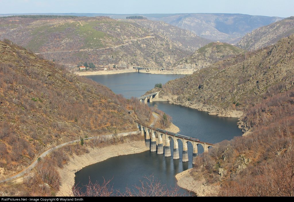 A spectacular view across Lac de Villefort as the very slightly delayed Le Cevenol from Clermont Ferrand to Marseille crosses the impressive viaduct. The picture here is surprisingly easy to reach from the station, along well travelled footpaths.