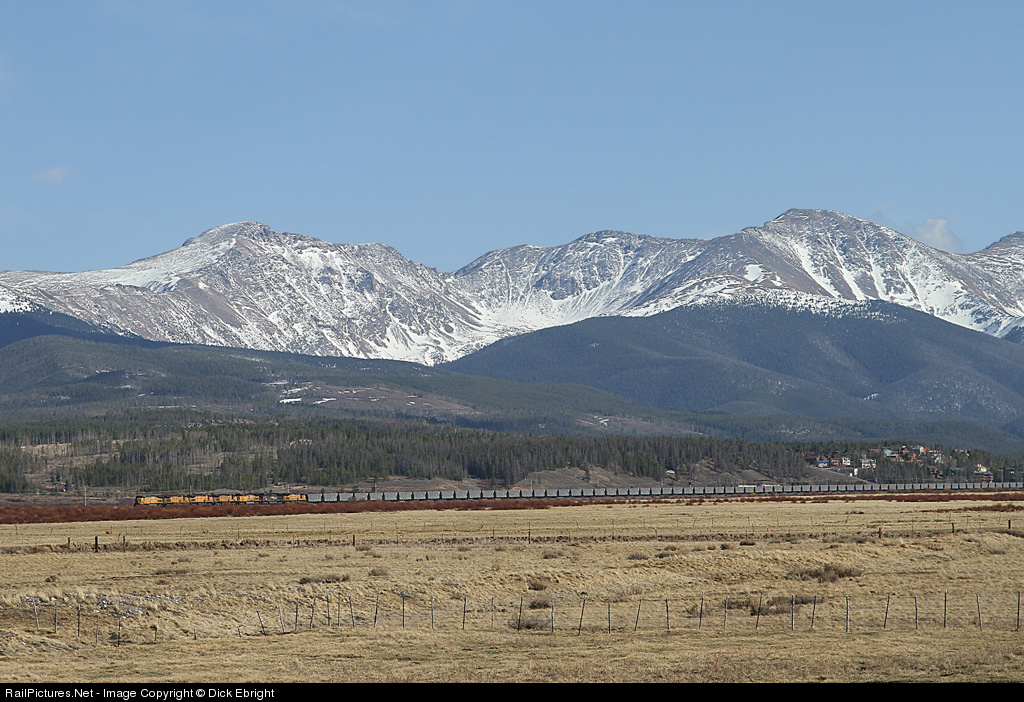 | UP 6438 is captured rolling west nearing the east switch of Tabernash siding. This empty coal train exited the Moffat Tunnel a few minutes ago at Winter Park, Colorado. The 13,000 foot peaks of the continental divide dominate the scene. |