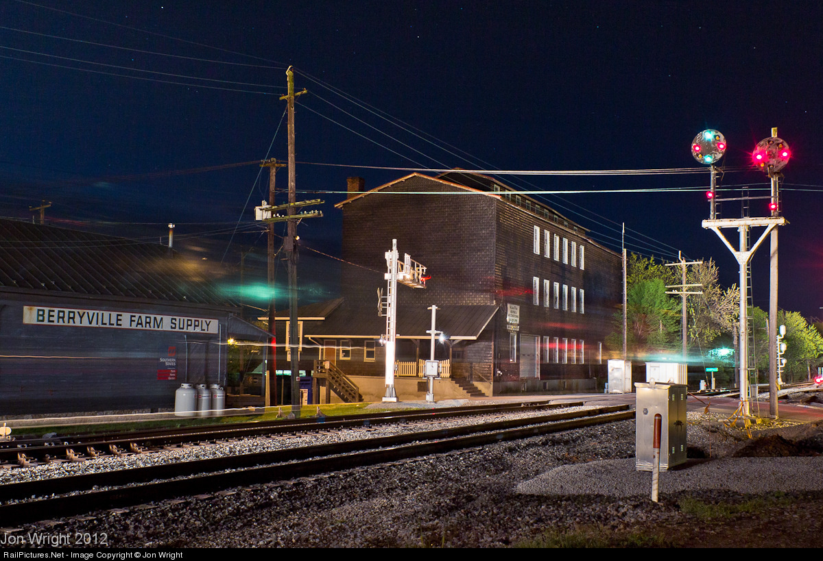 It's a few minutes before midnight and just like these signals, the day is winding down to its final moments. The Farm Supply and Ag Services across the tracks were once served by the railroad and the signal has stood guard for decades. Here a southbound Norfolk Southern trailer trains flies through this quaint bedroom community