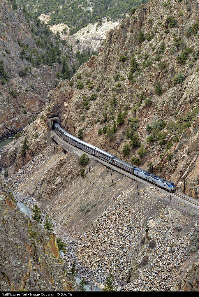 | Amtrak 6 exits Tunnel 40 deep down in Gore Canyon. If the view for the passengers down there looking up is anything like the view down then it is quite spectacular. |
