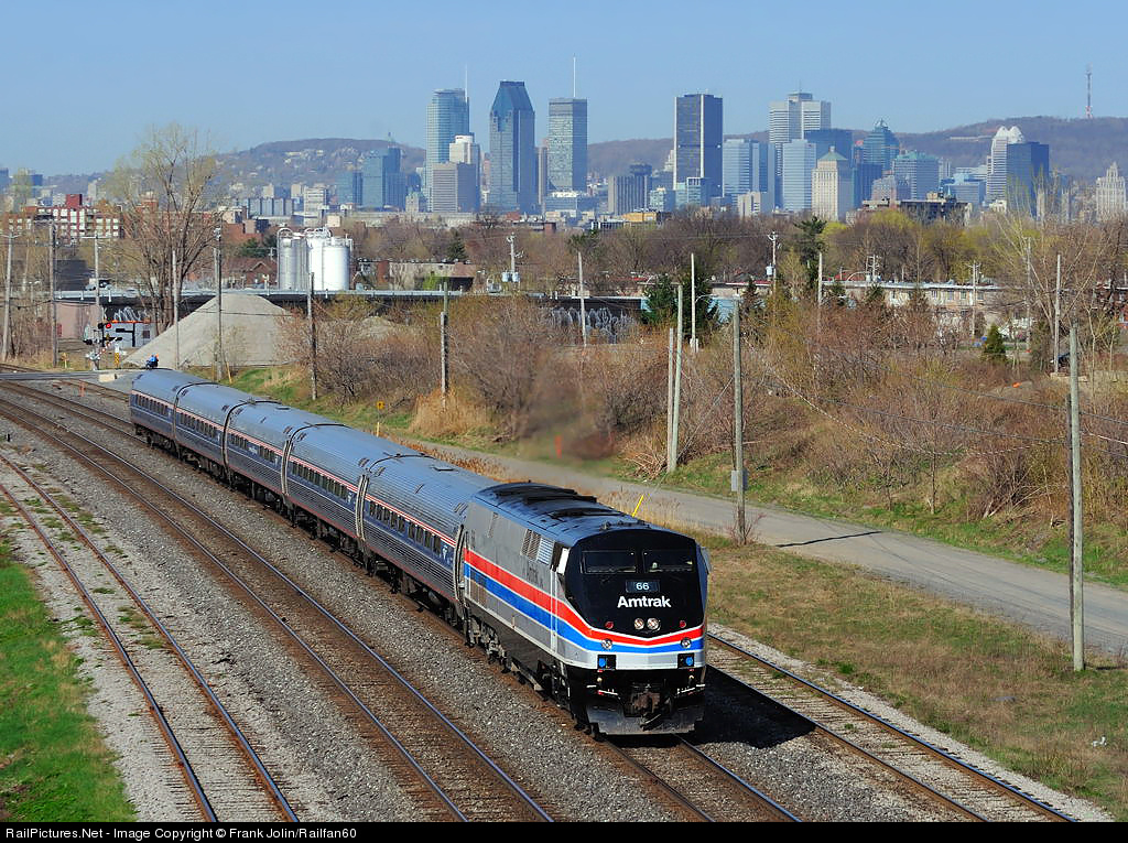 | Montreal-New York City Amtrak Adirondack with Phase II Heritage locomotive #66 races south on the Canadian National Transcon. Shortly the consist will cross over to the CN Rouses Point Subdivision |