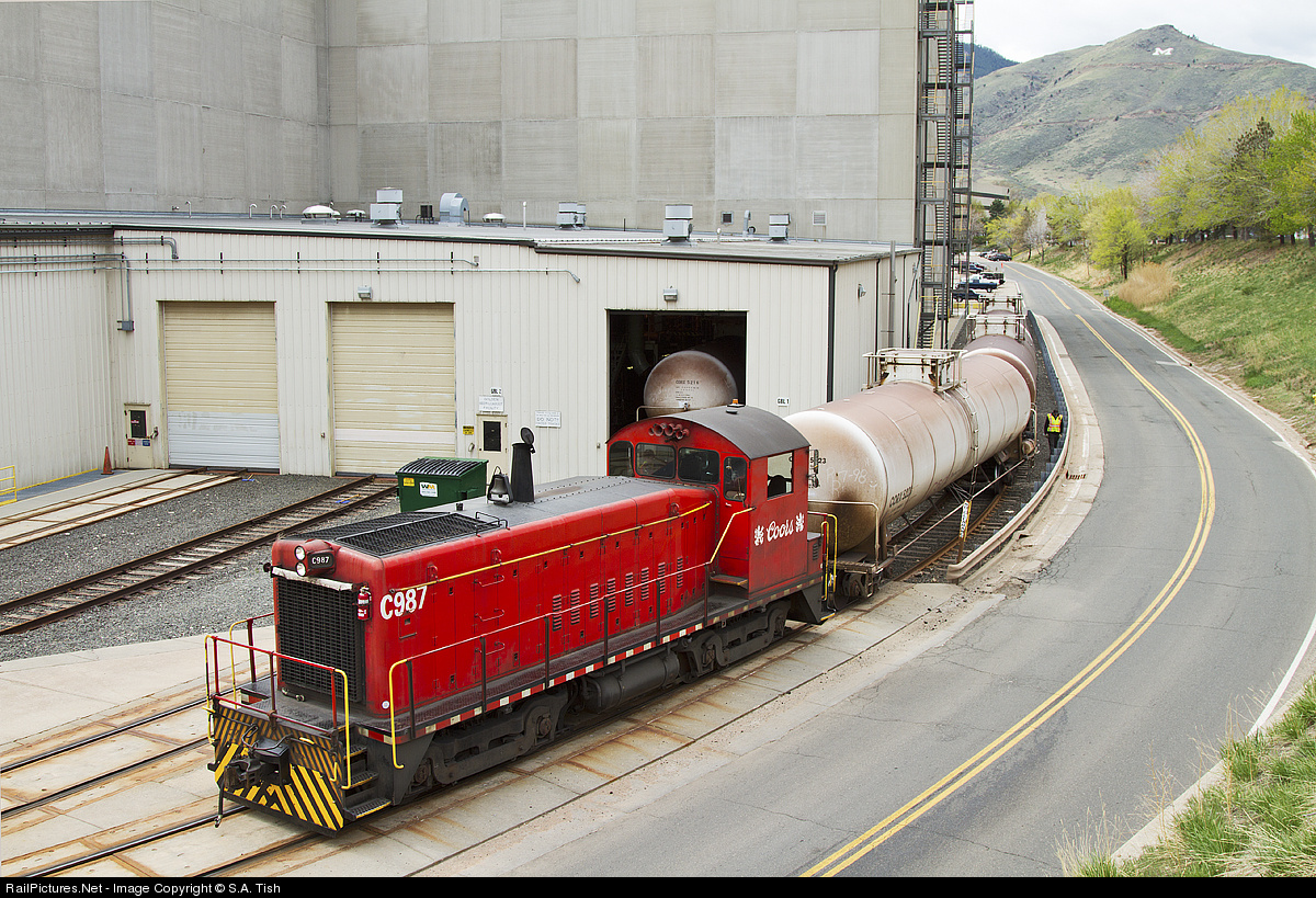 | Coors C987 spots 2 beer concentrate tank cars against one already in the siding next to the loading building. In the background is another Golden landmark in the form of Mt. Zion with the big M at the top for the Colorado School of Mines. |