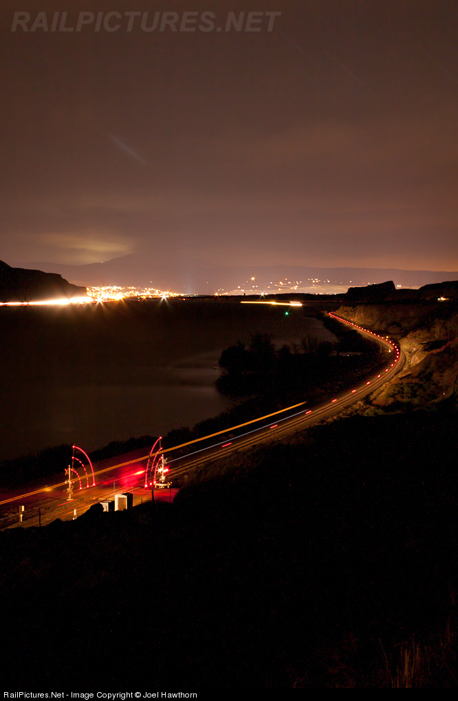 | The blinking of a FRED marks the passage of a westbound through the crossing at Avery along the Columbia River. Mt Hood is outlined in the background behind the lights of The Dalles, OR. |