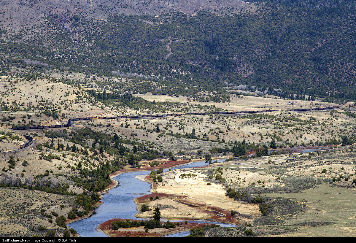 The entire length of a tiny looking eastbound coal train can be seen as it snakes its way through the Gore Canyon valley.