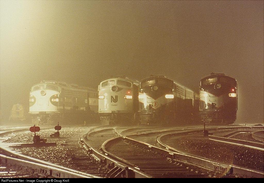 A rainy, foggy night on the Jersey coast finds E-8's #4330 (still in Southern green), 4323 (in the new white disco colors), 4285 & 4325 waiting out the night for the morning commuter rush.
