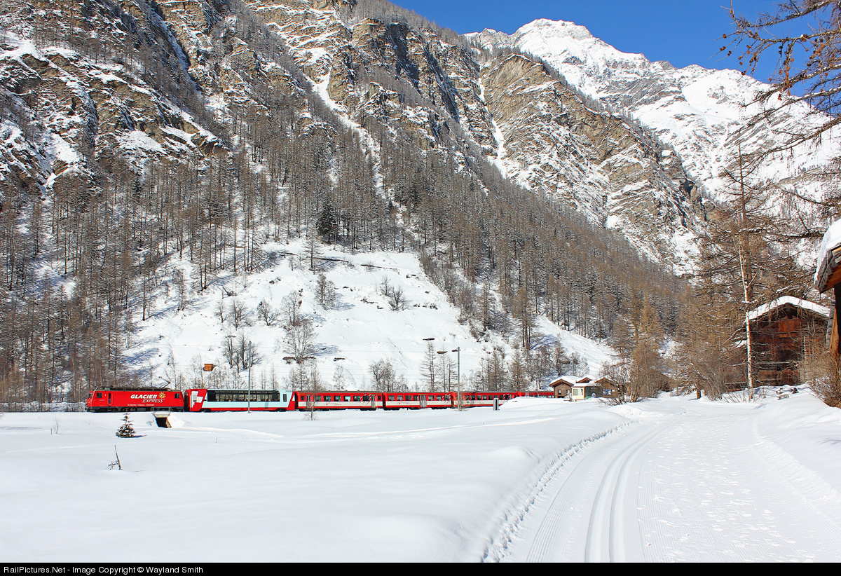 In Glacier Express livery, MGB No.4 is seen heading for Zermatt, here between Randa and Tasch.