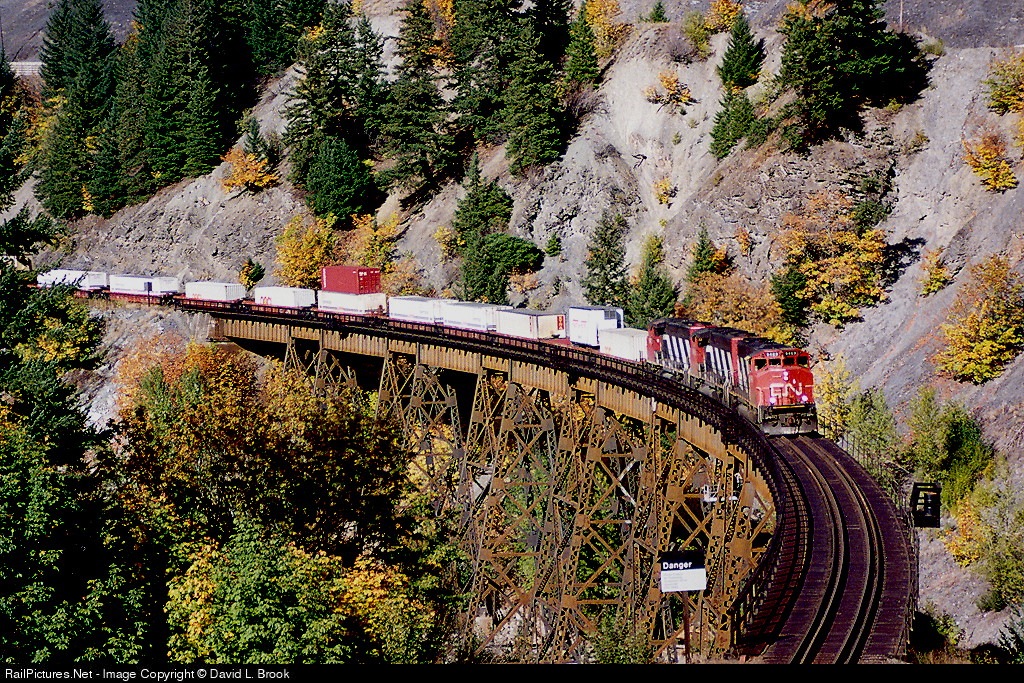 3 GP40-2's leave Boston Bar with a westbound hotshot crossing the Anderson River trestle