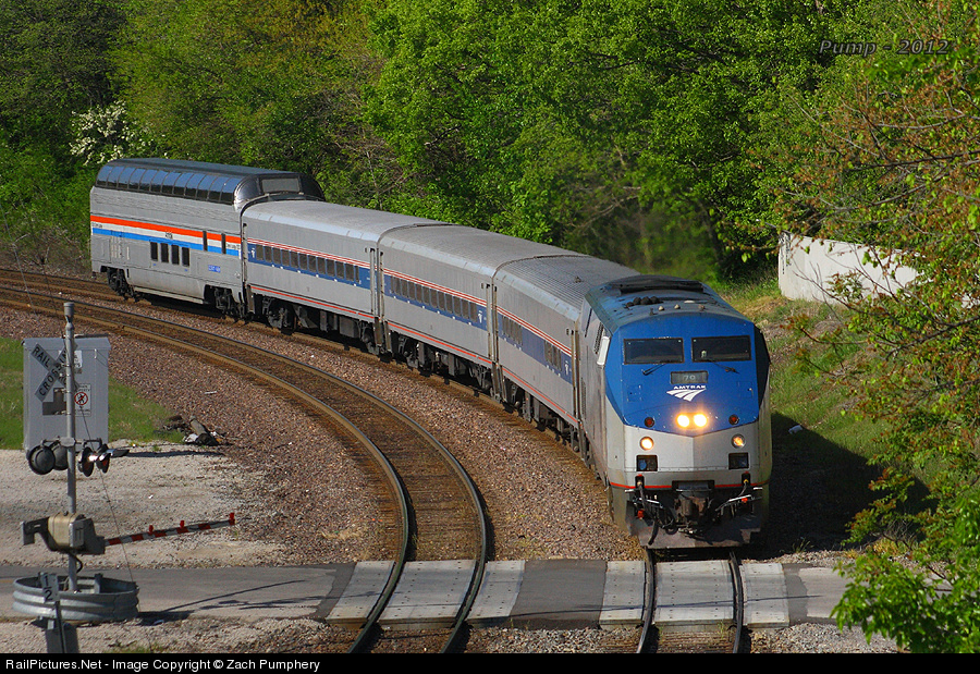 | Headed through Wilson Road on the UP Sedalia Sub. is the River Runner headed for St. Louis with AMTK 10031, the Great Dome “Ocean View” on the rear end. It might be Amtrak, but that car looks sweet. I wish I'd gotten to ride it this week but didn't get the chance. |