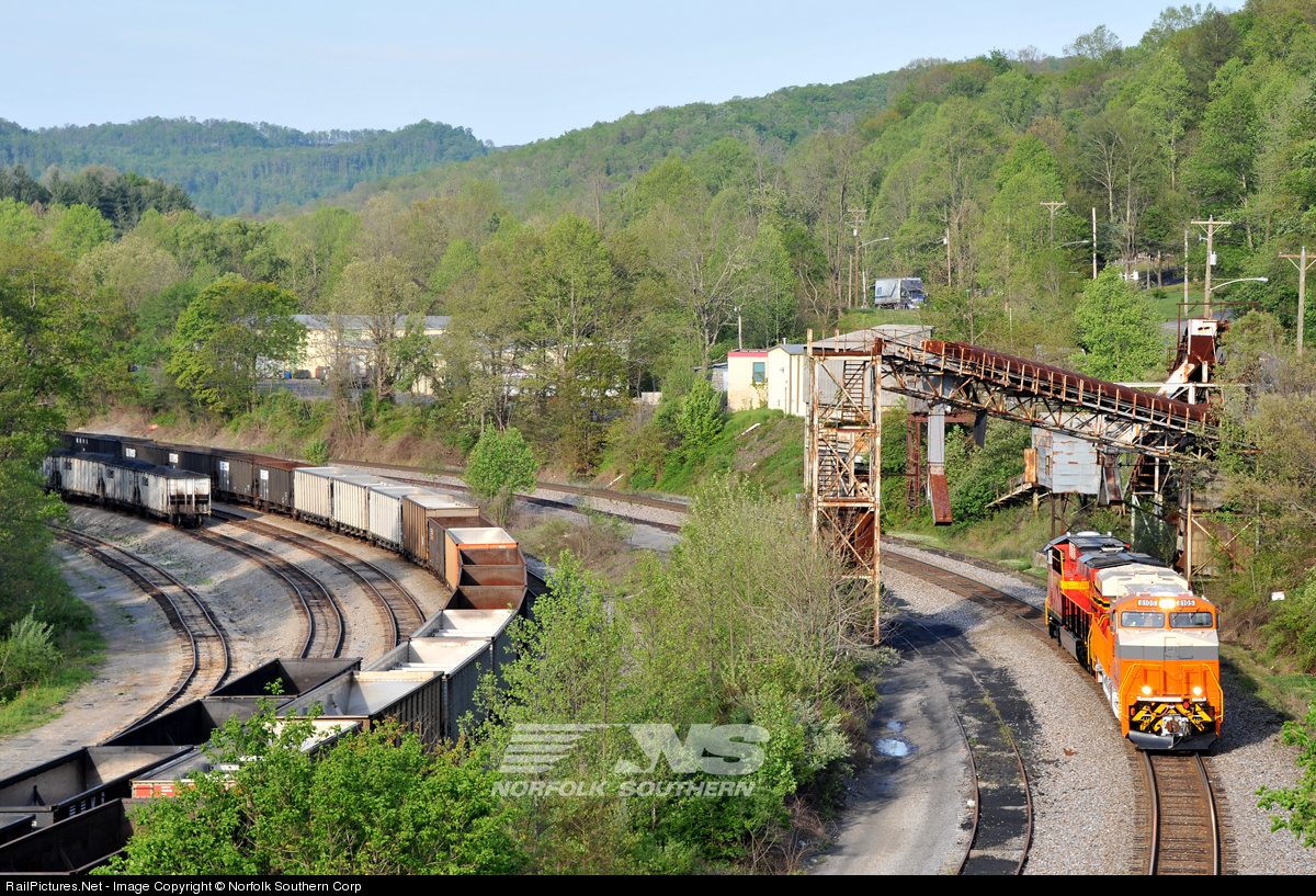 | Interstate 8105 and Norfolk Southern Railway Company 8114 return to Norton after dropping a cut of coal loads at Tacoma. The empty hoppers on the left are along the Interstate Railroad's mainline. Casey Thomason photo, copyright Norfolk Southern Corporation. For more information, visit www.nscorp.com