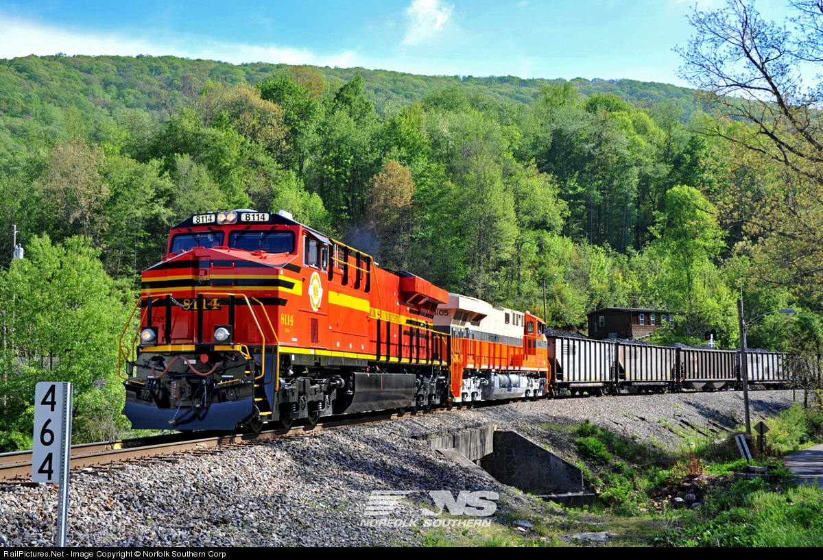 | Norfolk Southern Railway Company 8114 and Interstate 8105 shuffles a cut of coal from Norton to the storage track at Tacoma. Casey Thomason photo, copyright Norfolk Southern Corporation. For more information, visit www.nscorp.com