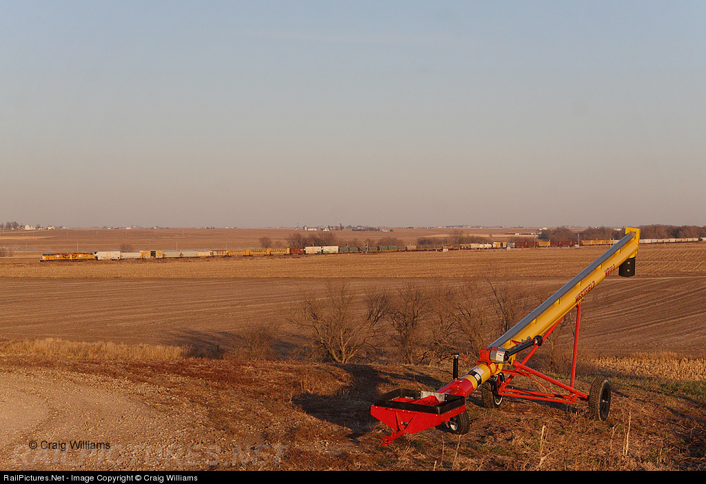 Golden light is cast as the sun is about to set. A westbound UP freight train rolls west thru central Iowa which is pretty much the open farm country. Fields and farmsteads is about all you'll find here.