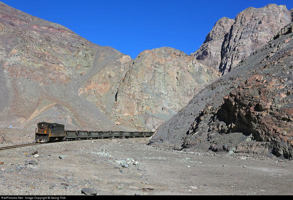GR12 # 412 of Ferronor (built by EMD in 1962) with empty hoppers from the Potrerillos smelter to the loading site above Llanta in the Quebrada del rio de la sal (Salt River gorge).