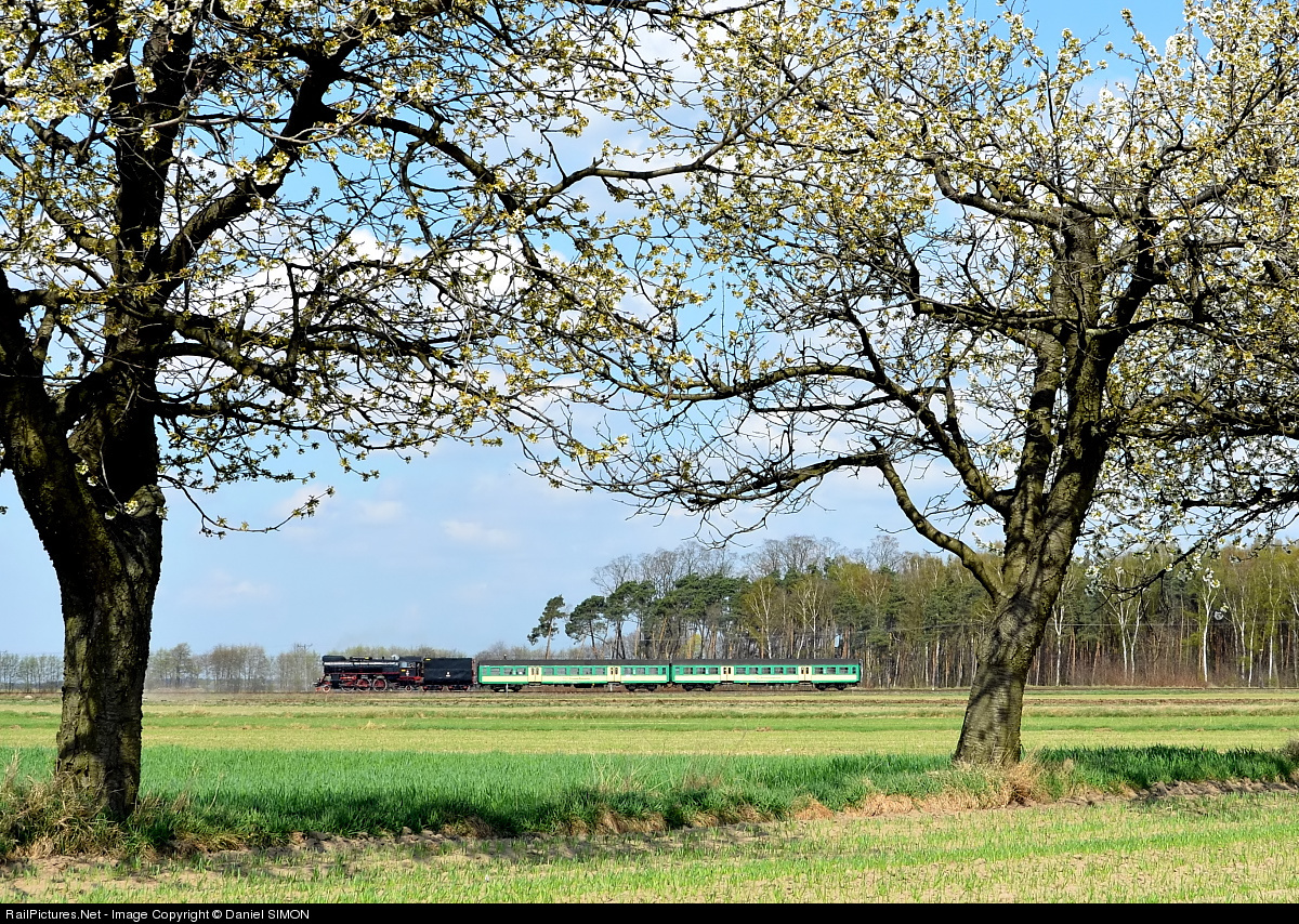 The cherry trees are in full blossom now in the Polish countryside. Ol 49 69 has just left Tloki station with the late morning passenger train to Wolsztyn.