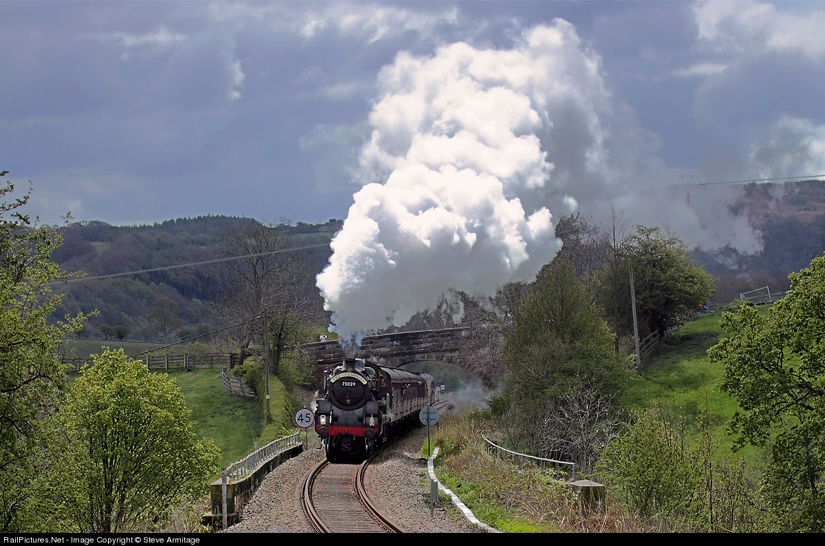 | The North Yorkshire Moors Railway extended their sphere of operations this weekend by running specials up the spectacularly beautiful Esk Valley as far as Battersby. With a deliciously moody backdrop of threatening skies and the distant moors, 75029 provides some added drama as she works up the grade past Glaisdale. |