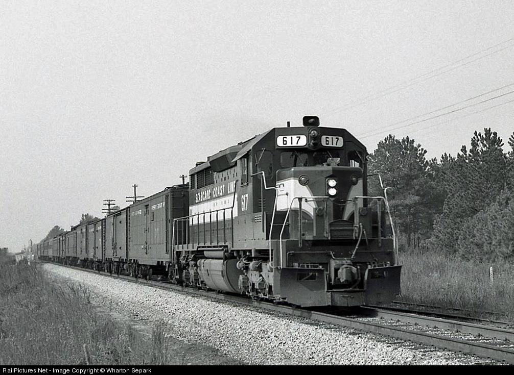 Seaboard Coast Line passenger, mail, & express train No. 4 slams through Bonsal, NC. The "Original" Norfolk Southern's Durham Branch crossed SCL at this remote community 24 miles south of Raleigh. NS incrementally abandoned the Durham Branch and an approximate 6 mile portion at Bonsal became the New Hope Valley Railway, a living railroad museum which still operates today with various locomotives and rolling stock on display.