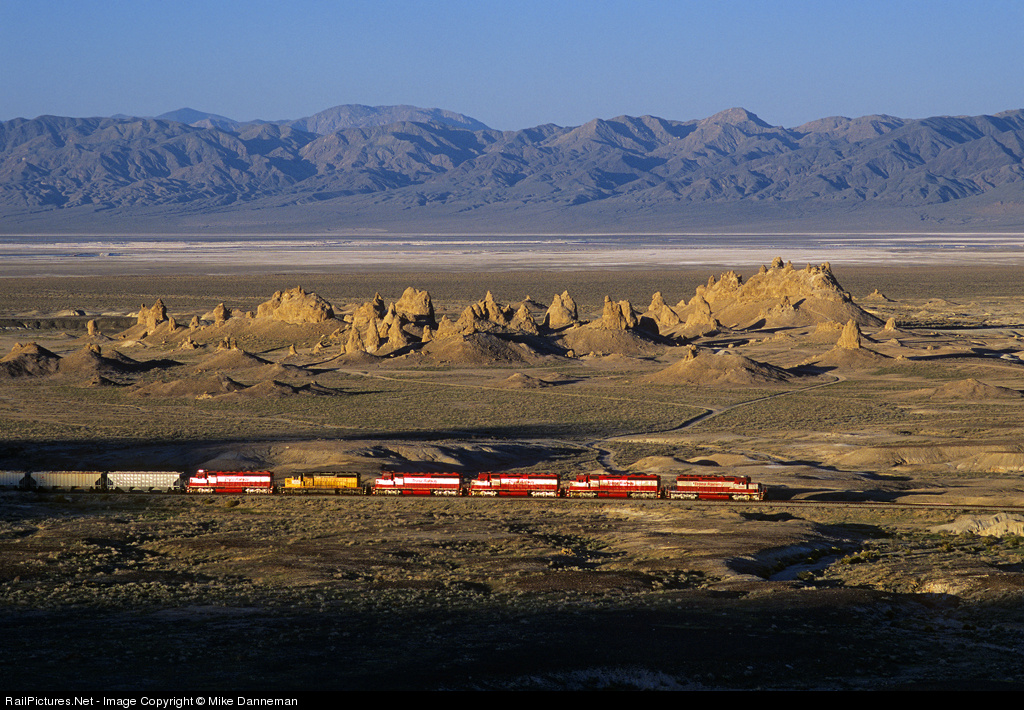 Near the southern edge of Death Valley, A Trona Railway freight heads toward the UP connection at Searles, California, moments before sunset on March 15, 2004. The train is passing the Pinnacle National Natural Landmark called the “Trona Pinnacles,” and is powered by two SD40-2s and four ex-Santa Fe SD45-2s.