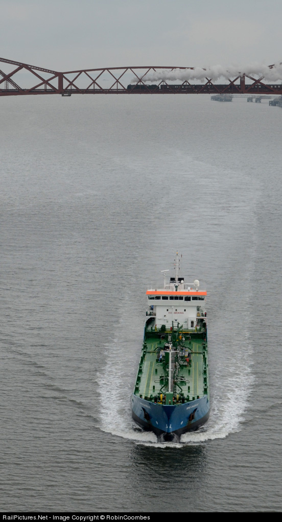With a clear navigation headroom of 45 m trains and large ships can pass each other, by pure luck Royal Scot 46115 Scots Guardsman crosses with the Great Britain 5 railtour while the Dutch Chemical carrier MV Bro Gazelle sails under on route to Grangemouth. See IDXXXXXX for the wide view