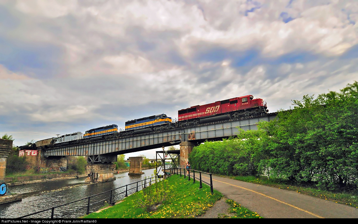 | Canadian Pacific ethanol train #642 crosses the historic Lachine Canal as it leaves the Island of Montreal. The canal became obsolete in the second half of the 20th century, being replaced by the St. Lawrence Seaway, which opened in 1959. The canal was finally closed to shipping in 1970. |