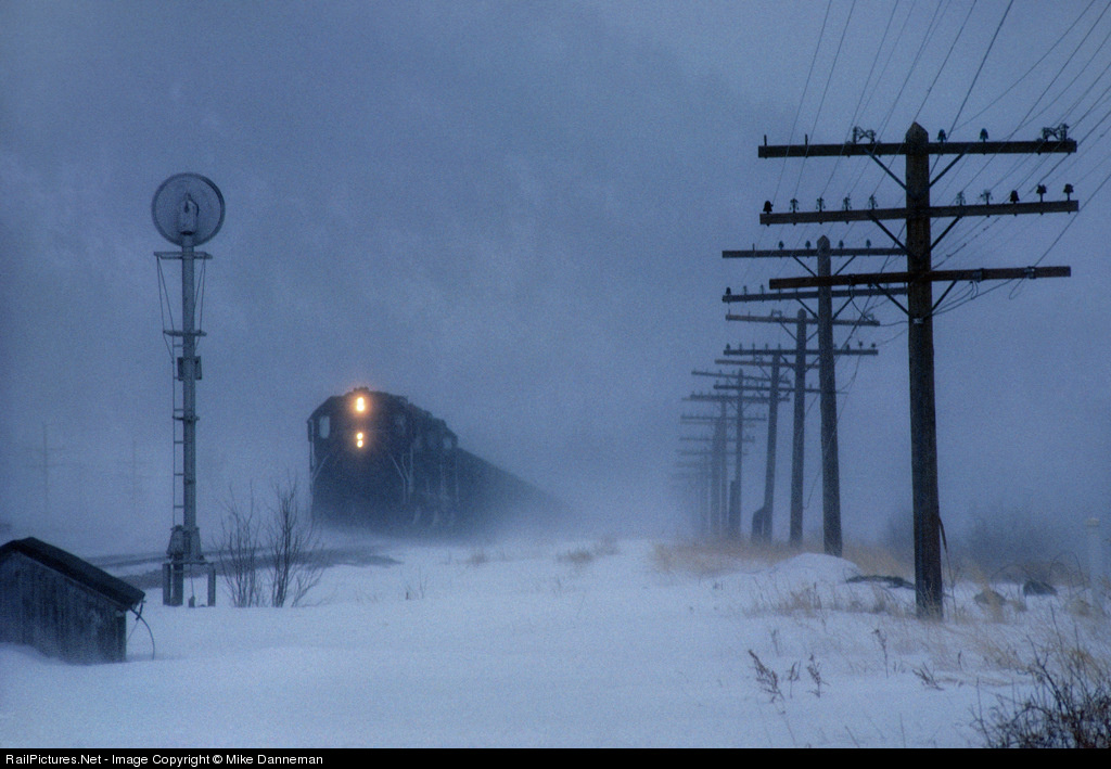 During a windy and frigid springtime snowstorm, a Rio Grande coal train approaches the Moffat Tunnel at East Portal, Colorado.
