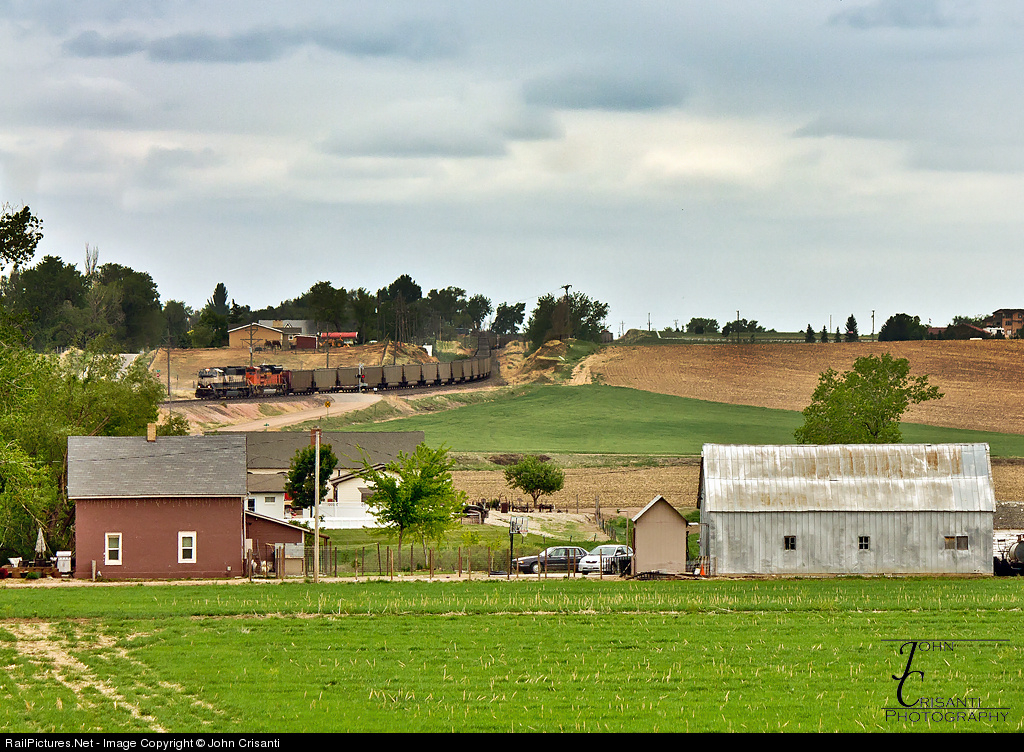 | Easing down Berthoud Hill, this coal empty slows down as they pass through the country side and farm houses just south of Berthoud, CO. |