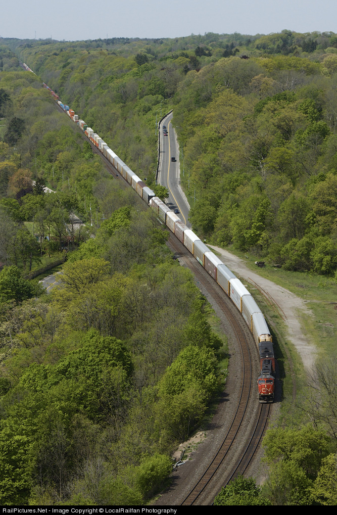 Well worth the hike: It is arguable that the best spot to take photos of trains in Dundas would be from the peak. On a cloudless spring afternoon with fresh greenery apparent, the distant whine of dynamic brakes, disturbs the otherwise quite valley. Dwarfed by the expanse of the Dundas Valley, CN 5694-2426 lead eastbound hotshot 148 downgrade towards Bayview Junction and points east. The engineer exchanged a few short blasts of the horn for a railfan down below, who was likely enjoying the weather much like the other railfans on the peak.