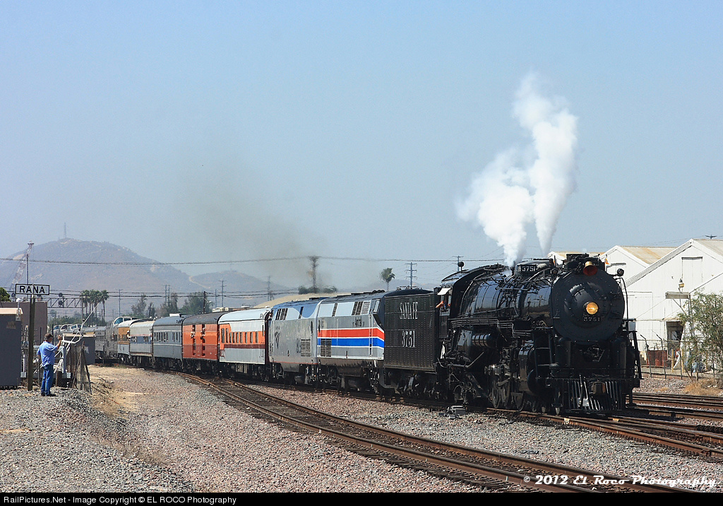 AT&SF 3751 at Rana - AT&SF 3751 pulls the Grand Canyon Excursion Train through CP Rana on the way to a watering and service at BNSF's "A" Yard at the San Bernardino Station. Today's train will go from Los Angeles to Parker Arizona with an expected arrival time well after midnight.