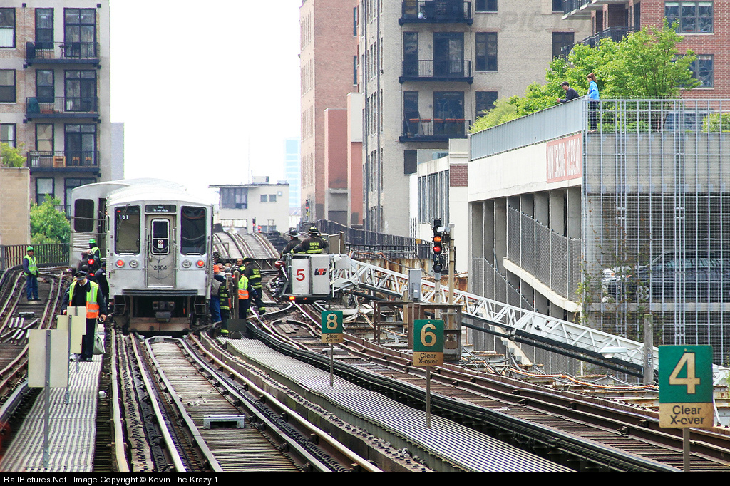 | A private excursion on the CTA came to a quick stop when car 2279 picked the frog of the northbound main switch leading into the 14th Street Middle Track. Firefighters are still on the scene making sure the people in the last car were able to get off safely. This shot was taken standing on the tracks just south of the Roosevelt Road Green / Orange line stop. CTA was nice enough to give us another excursion in the near future with these 2200 series cars which are currently being retired as the new 5000s arrive. |