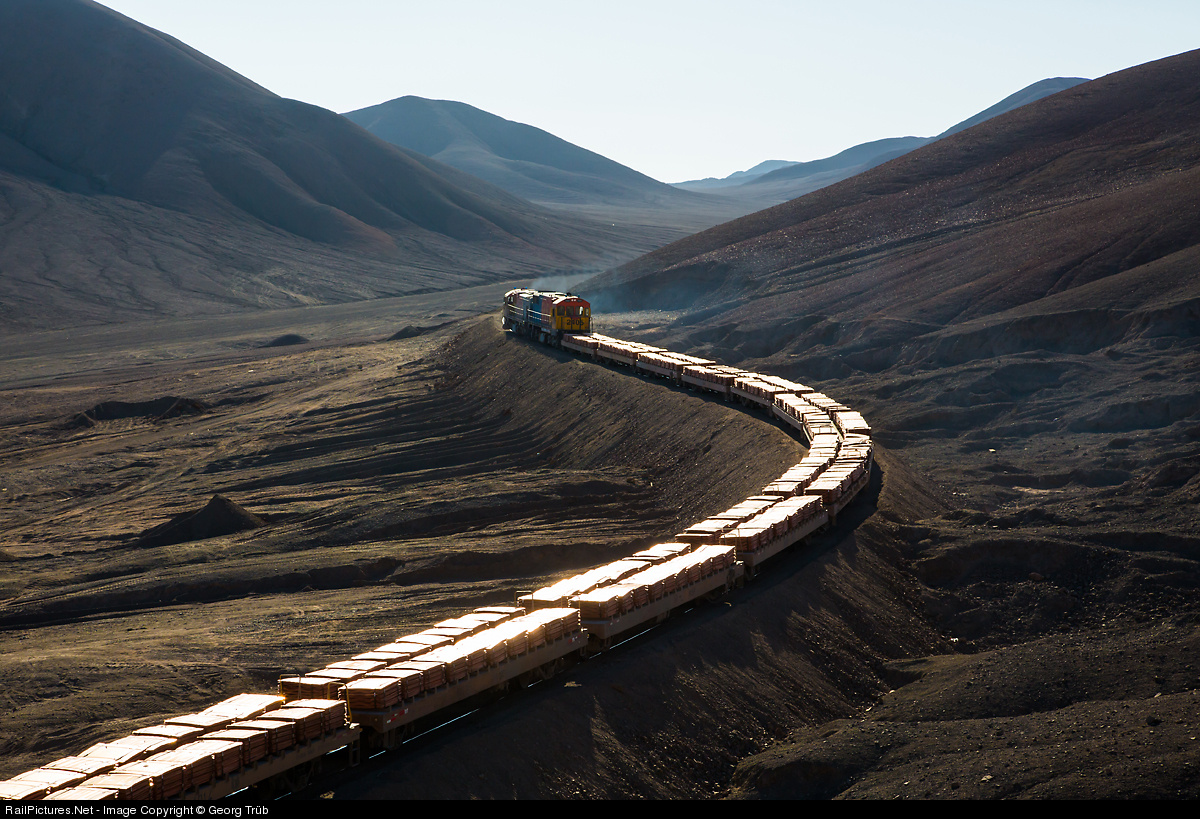 "Gold of Chile". An uphill train on Cumbre pass transporting a large load of copper plates on flat cars from Chuquicamata (probably) to the port of Mejillones for export. About one third of Chile's income is from copper.