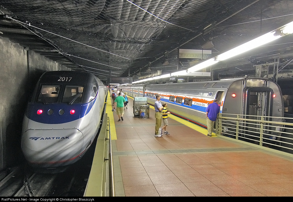 | National Train Day 2012 at Grand Central Terminal. Two of the Amtrak displays at Grand Central Terminal for National Train Day were an Acela trainset with power car 2017 (power car 2036 was on the other end) on Track 37 and the 40th Anniversary exhibit train (with P40 822 on the head end) on Track 36. Late in the day, the crowds have thinned out, allowing for open shots of the two displays. |
