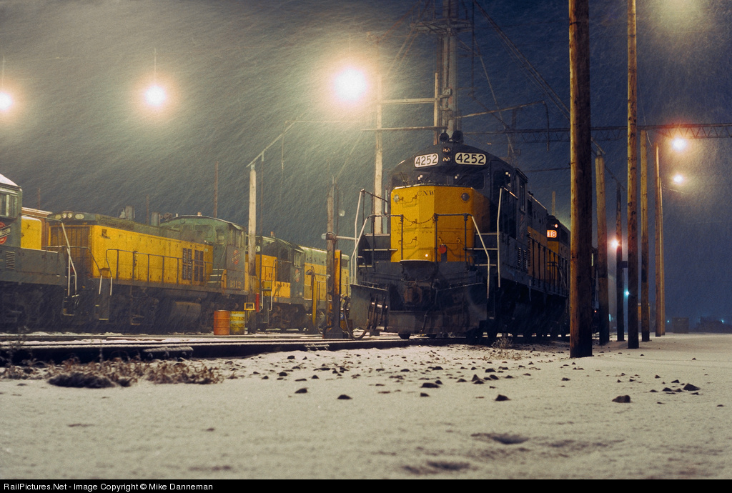 | On a December 1983 evening, Chicago and North Western power rests through a swirling snowstorm at Butler Yard, Wisconsin.