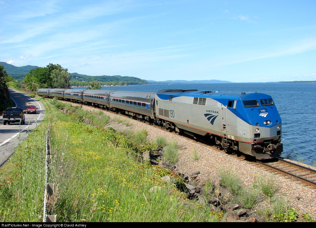 | Under clear skies here in upstate New York, Amtrak's aptly named "Adirondack" speeds south along the west shore of Lake Champlain after making her station stop in town. |