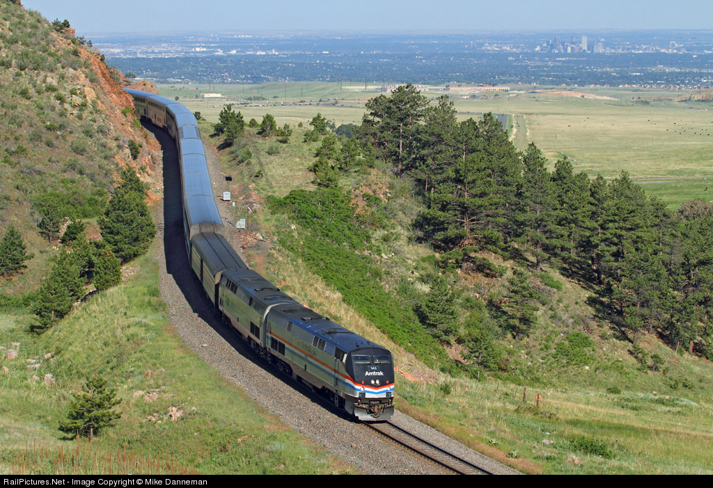 Amtrak’s “Heritage III” No. 145 is on the point of the eastbound California Zephyr on the afternoon of June 22, 2011. Having just left Plain and passed through Tunnel 1, the train is about to cross Highway 72 and Coal Creek Canyon, and head to Clay and Rocky on the decent off the Front Range. The city of Denver is in the background to the right.