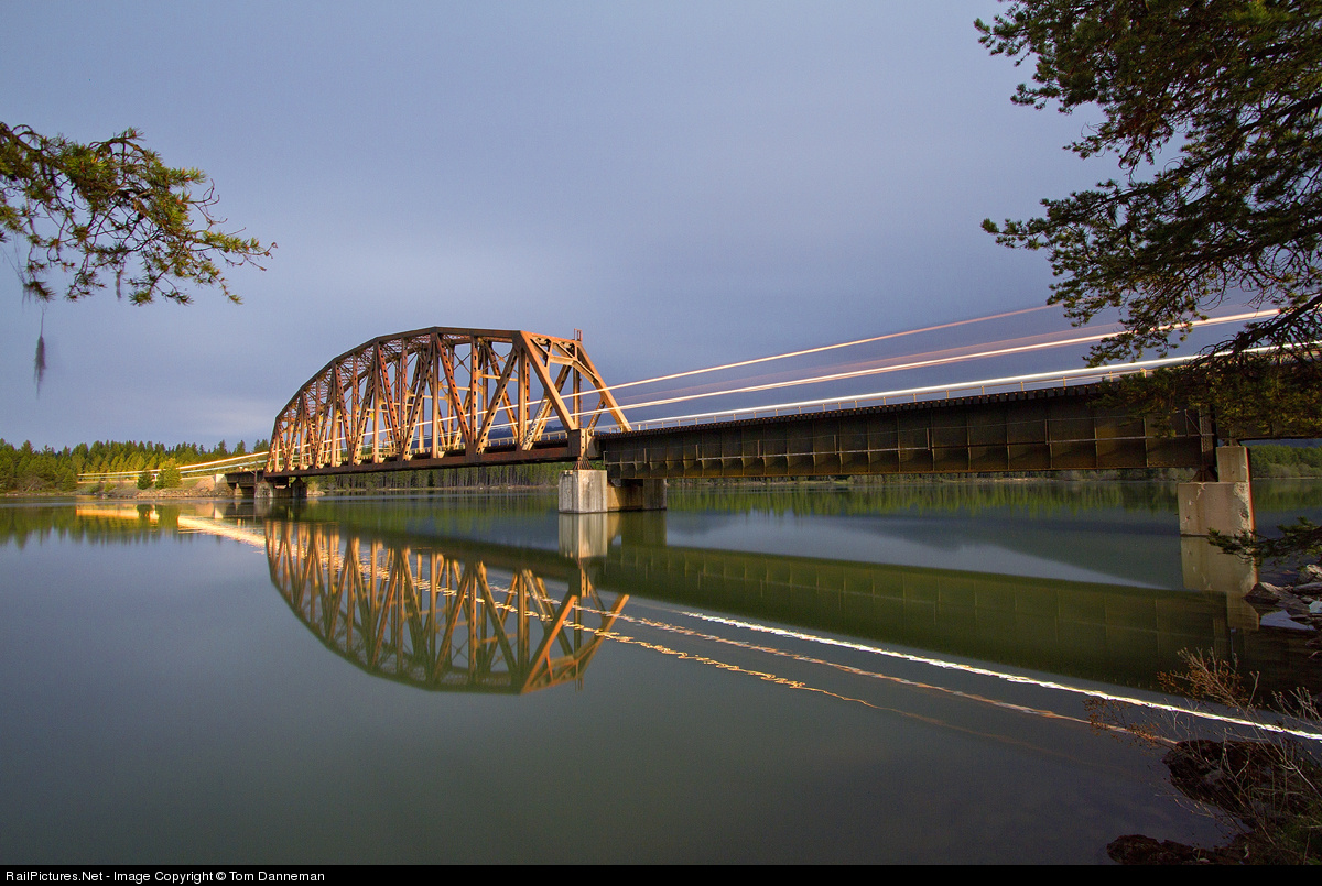 I can't describe how peaceful, calm, and quiet it was out here waiting for a train to show up just after midnight. No noises made by humans, only an occasional goose, or coyote. It was a spectacular early morning with a full moon popping in and out of the clouds. A westbound would shatter that peace and quiet but that was O.K. with me. Here, west of Trout Creek at Montana Rail Link's Bridge 57, the westbound BNSF coal train streaks over the Clark Fork River.