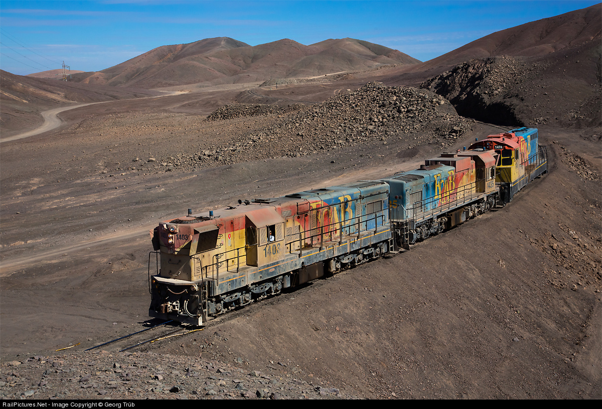 Three locomotives running down Cumbre pass east side. GR12U # 1403 and Clyde built G22 # 1435 (former WAGR A1518) had been midtrain helper on a train on the west side befor (see photo ID 398299), NF210 # 1416 was third locomotive in a train in the east from Prat.